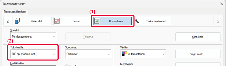 Valitse tämä tila, kun haluat tulostaa värivalokuvat suuremmalla tarkkuudella ja tulostaa ohuet viivat selvästi. |