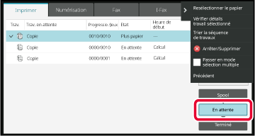 Appuyez sur le travail que vous désirez arrêter ou supprimer, puis sur la touche [Arrêter/Supprimer] du panneau de sélection.