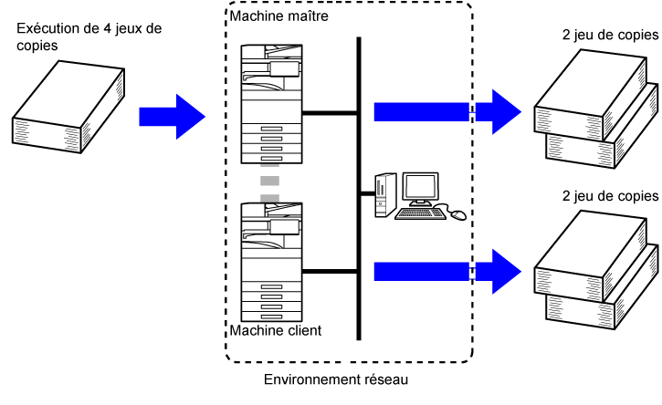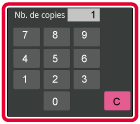 Vous pouvez sélectionner jusqu'à 9999 copies (jeux). Le nombre de copies spécifié est partagé entre l'unité principale et l'unité secondaire. Si le nombre de copies est impair, l'unité principale maître réalise davantage de copies que l'unité secondaire.