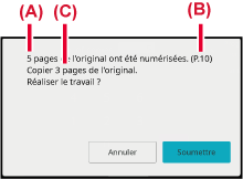 Dans l’écran de confirmation, le nombre de feuilles de l’original numérisées s’affiche dans (A), le nombre de faces numérisées s’affiche dans (B) et le nombre de copies en excluant les pages blanches s’affiche dans (C).