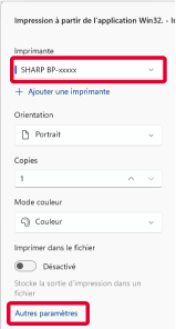 Sélectionnez le pilote d'imprimante pour la machine et cliquez sur [Plus de réglages].