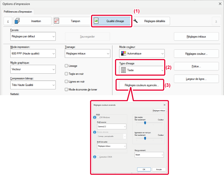 gestion des couleurs, sélectionnez les réglages de votre choix dans