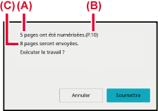 Un signal sonore retentira pour signaler que la numérisation est terminée.Lorsque la numérisation est terminée, vérifiez le nombre de feuilles de l'original et le nombre de feuilles à envoyer, puis appuyez sur la touche [OK] pour démarrer la transmission.