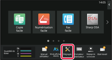 Le "Réglages" permet de gérer différentes fonctions afin de faciliter l'utilisation de la machine, par exemple l'enregistrement par défaut pour chaque fonction, le réglage de la connexion réseau et la vérification du journal de l'état de fonctionnement.