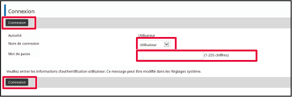 • Pour plus de détails sur les procédures de connexion lorsque l'authentification utilisateur est activée, reportez-vous à la section " AUTHENTIFICATION UTILISATEUR".