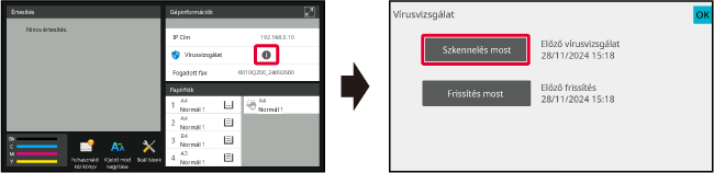 Ha a bemeneti adatokban vírust észlel , az érintőpanel jelzi a vírus észlelését, a bemeneti adat vagy a beérkező feladat meg lesz szakítva és az adat vagy a kimenetre küldendő feladat el lesz vetve. A bemeneti adatforráson (USB memória, külső szerver stb.) szereplő adat nem lesz törölve. Ha a kimeneti adatokban vírust észlel , az érintőpanel jelzi a vírus észlelését, a kimeneti adat vagy a kiküldendő feladat meg lesz szakítva és a kimeneti adat vagy a feladat adatai törlésre kerülnek. Vírusészleléssel kapcsolatos üzenet jelenik meg a rendszeradatok képernyő "Értesítés" területén. |