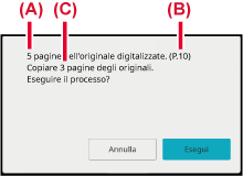 Nella schermata di conferma, il numero dei fogli originali digitalizzati è indicato in (A), il numero dei lati digitalizzati è indicato in (B) e il numero di copie, escludendo le pagine vuote, è indicato in (C).