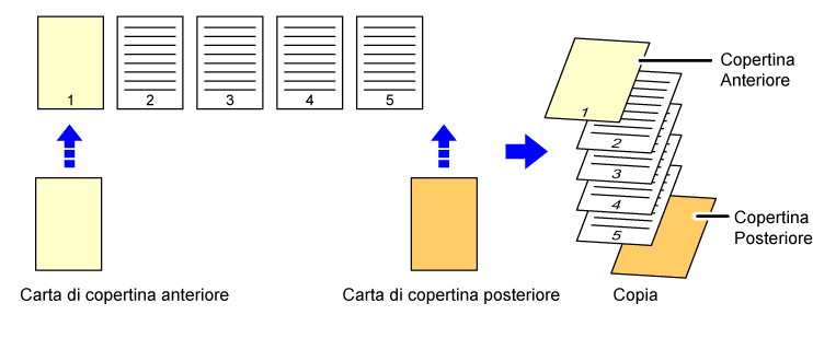 ![]() Esegue una copia a una facciata della prima pagina dell'originale, per la copertina anteriore, e inserisce una copertina posteriore alla fine delle copie. |