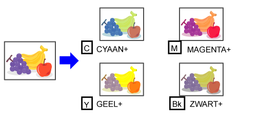 van de kleuren geel, magenta, cyaan en zwart verdeeld in drie bereiken