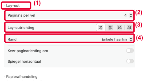 Wanneer bijvoorbeeld [2 pagina's op 1 vel] en [4 pagina's op 1 vel] is geselecteerd,