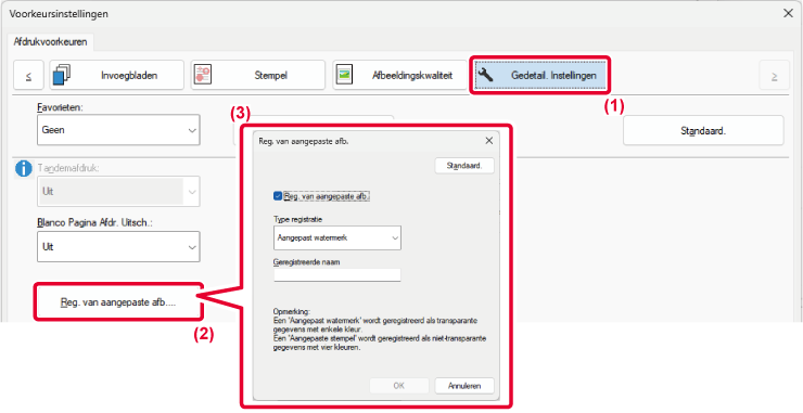 Als [Aangepast watermerk] is geselecteerd, wordt een transparante watermerkafbeelding
