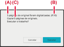 På bekreftelsesskjermen vises antall skannede originalark i (A), antall skannede sider i (B) og antall kopier med unntak av tomme sider i (C).