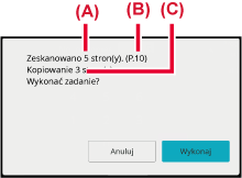 Na ekranie potwierdzenia w polu (A) zostanie wyświetlona liczba zeskanowanych arkuszy oryginału, w polu (B) – liczba zeskanowanych stron, a w polu (C) – liczba kopii z pominięciem pustych stron.
