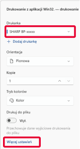 Wybierz sterownik drukarki dla urządzenia i kliknij [Więcej ustawień].