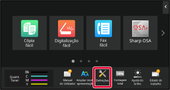 Se estiver ligado um dispositivo USB à máquina, aparece uma janela de pop-up. Toque na tecla [OK].Premir a tecla [Definições] no Ecrã Inicial.