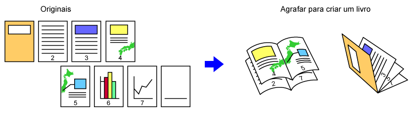 Coloque o original na bandeja do alimentador de documentos do alimentador automático de documentos ou no vidro de exposição.Prima a tecla [Outros] e a tecla [Livro] ou prima a tecla [Agrafar Ordenar] e depois a tecla [Agrafador De Encadernar].