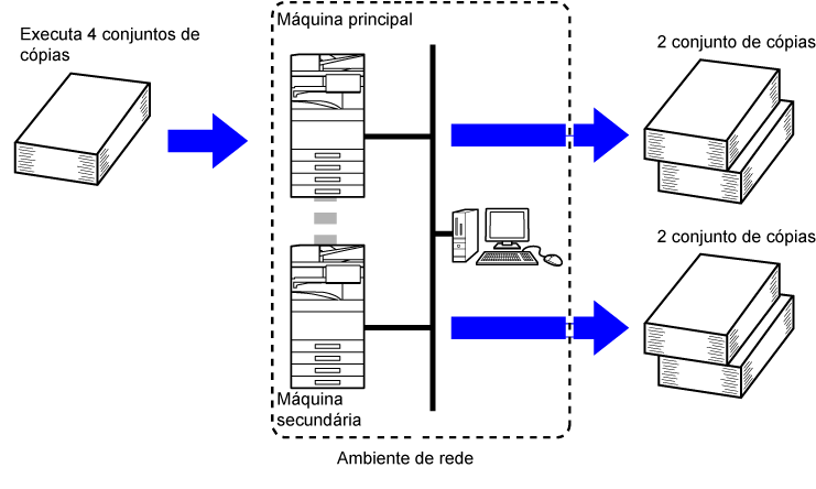 Pode definir até 9999 cópias (conjuntos). O número de cópias especificado é partilhado pelas unidades primária e secundária. Se o número de cópias for ímpar, a unidade primária efetua mais cópias do que a unidade secundária.