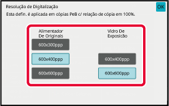 A resolução pode ser definida para o alimentador de documentos e o vidro de exposição. Depois de concluídas as definições, toque nas teclas [OK] e [Anterior] em sequência.