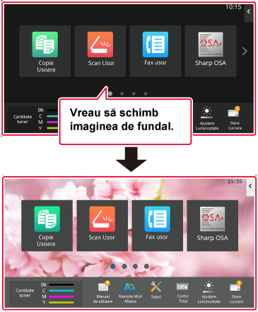 Atingeți [Setări sistem] → [Setări ecran principal] → [Imagine fundal], apoi atingeți tasta [Modifica].