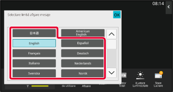 Anumite setări pot solicita introducerea parolei de utilizator. Dacă nu aţi efectuat autentificarea ca utilizator, trebuie să introduceţi parola de administrator.Selectați din listă limba pe care doriți să o schimbați.