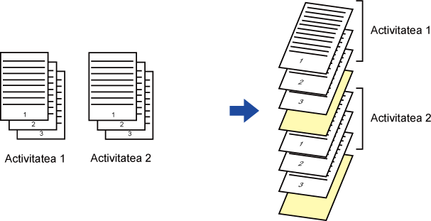 De exemplu, dacă imaginile imprimate de dimensiuni A4 (8-1/2" × 11") și A3 (11" × 17") sunt amestecate, numai hârtia de dimensiunea A3 (11" × 17") este împăturită și modificată la hârtie de dimensiunea A4 (8-1/2" × 11"). Copiile sunt scoase coală după coală. |