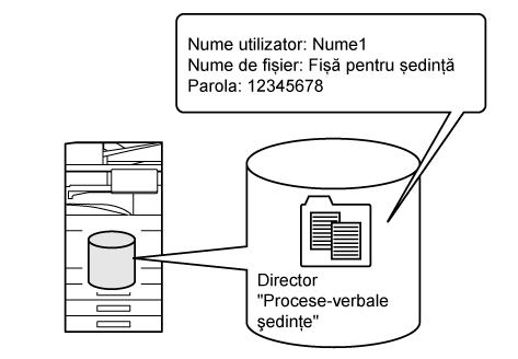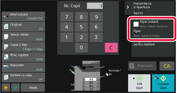 În timpul copierii, al trimiterii unei imagini sau al oricărei alte operații, această funcție salvează pe hard disk datele documentului. Utilizaţi această funcţie când doriţi să salvaţi rapid şi uşor datele documentului, fără să specificaţi un nume de fişier sau alte informaţii. Fişierul salvat poate fi utilizat de asemenea de alte persoane. Nu utilizaţi această metodă pentru a salva fişiere care nu doriţi să fie utilizate de alte persoane. |
