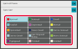 Завершите изменение настроек и коснитесь кнопки [OK]на экране [Один Цвет]. Убедитесь в том, что измененныенастройки отображаются на экране цветного режима рядом с кнопкой [Один Цвет].