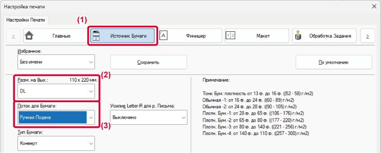 конверт, для параметра [Тип бумаги] автоматически устанавливается значение