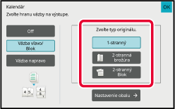 Umiestnite originál do zásobníka automatického podávača dokumentov alebo na predlohové sklo.Klepnite na tlačidlo [Ostatné] a potom na tlačidlo [Kalendár] alebo klepnite na tlačidlo [Tredit a zošívat] a potom na tlačidlo [Sedlová väzba].