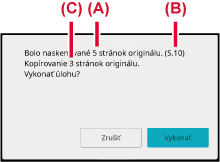 Na obrazovke s potvrdením sa počet naskenovaných hárkov originálu zobrazí v časti (A), počet naskenovaných strán sa zobrazí v časti (B) a počet kópií bez prázdnych strán sa zobrazí v časti (C).