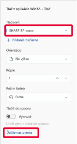 Vyberte ovládač tlačiarne pre zariadenie a kliknite na tlačidlo [Ďalšie nastavenia].