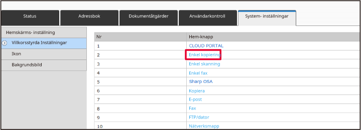 När fabriksinställningarna är aktiva måste du ange ditt användarlösenord efter det att du angett IP-adressen.Klicka på fliken [Systeminställningar] →[Hemskärms- inställning]→ [Hemknappens position] på webbsidan.