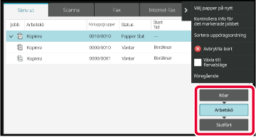 Tryck på [Köar], [Arbetskö] eller [Slutför] för