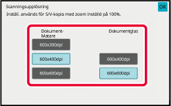 Upplösningen kan ställas in på både dokumentmataren och dokumentglaset. Tryck på [OK] och [Föregående] efter varandra när du är klar med inställningarna.