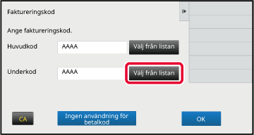 för att slutföra registreringsproceduren.Tryck på knappen [Välj från listan] för huvudkoden när inmatningsfönstret för faktureringskoder visas.