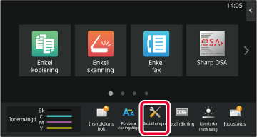 I "Inställningar" kan du hantera olika funktioner som underlättar användningen av maskinen, som t.ex. standardregistrering för respektive funktion, inställningar för nätverksanslutning och loggkontroll av driftstatus.