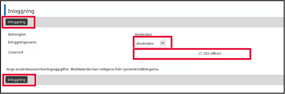 Beroende på maskininställningarna kan användarautentisering krävas för att inställningsläget ska visas (webbversionen).