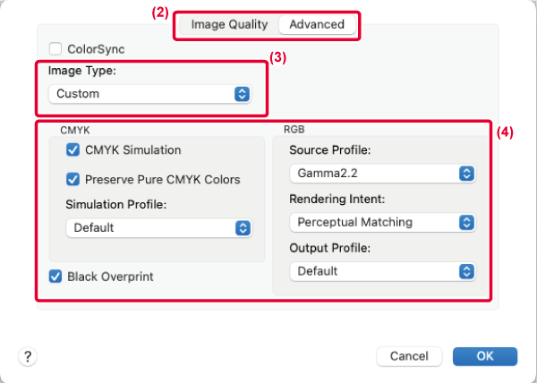 için, "Image Type" bölümünde [Custom] seçin, [CMYK Simulation] onay