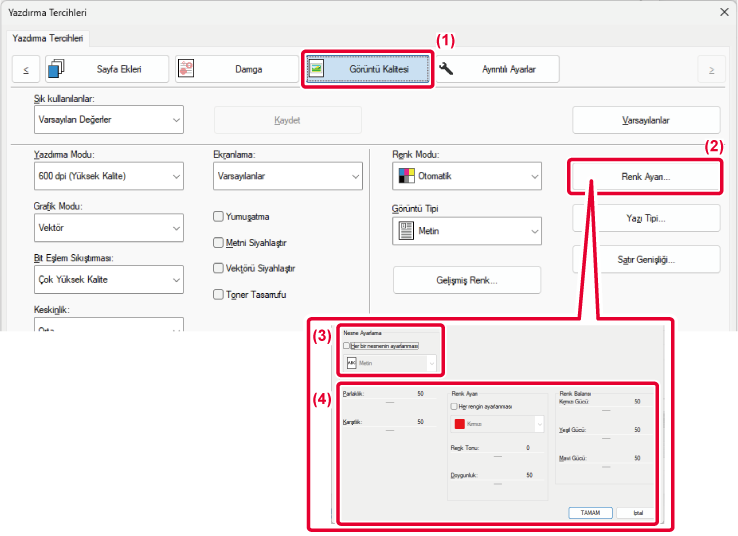 görüntüleme gibi gelişmiş renk ayarları da renkli görüntü yazdırma