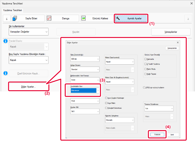 görüntülerin yazıcı sürücüsünde veya makinede oluşturulmasını tercih