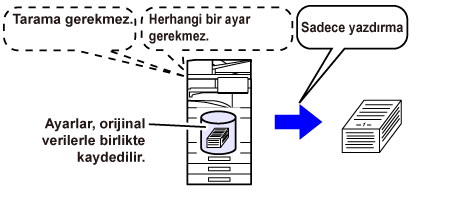 Fotokopi, görüntü gönderme ve diğer işler yapılırken bu işlev belge verisini yerel sürücüye kaydeder. Dosya adı veya diğer bilgileri girmeden hızlı ve kolay şekilde belge verilerini kaydetmek istiyorsanız bu işlevi kullanın. Kaydedilen dosya diğer kişiler tarafından da kolayca kullanılabilir. Başkalarının kullanmasını istemediğiniz dosyaları kaydetmek için bu yöntemi kullanmayın. |