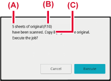 On the confirmation screen, the number of scanned original sheets appears in (A), the number of scanned sides in (B), and the number of copies excluding blank pages in (C).