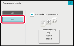 Place the original in the document feeder tray of the automatic document feeder, or on the document glass.Tap the [Others] key, and then tap the [Transparency Inserts] key.