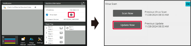 The update will be canceled and the touch panel will display that the updated file is damaged. After the user confirms the contents and closes the screen, the machine will operate with the firmware before the update. If the firmware was updated remotely, the update will be canceled and the virus detection information will be displayed in the "Notification" of the System Information screen. The machine will operate with the firmware before the update |
