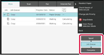 status, tap the [Spool], [Job Queue] or [Complete] key as desired.