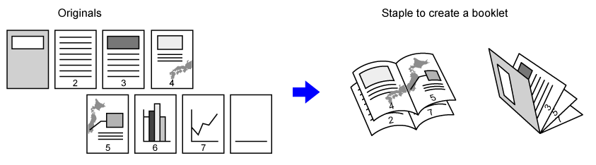 Place the original in the document feeder tray of the automatic document feeder, or on the document glass.Tap the [Others] key and then the [Booklet] key, or tap the [Staple Sort] key and then the [Saddle Stitch] key.