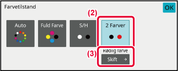 Når indstillingerne er fuldførte, skal du trykke på tasten [OK] på skærmen [2 Farver] og kontrollere, at den ændrede indstilling vises ved siden af tasten [2 Farver] på farvetilstandskærmen.Originalen kopieres i en enkelt farve.