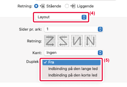 - Vælg [Ingen], [Lang kant] eller [Kort kant] i 2-sidet udskrivning.
