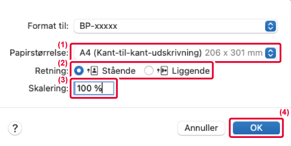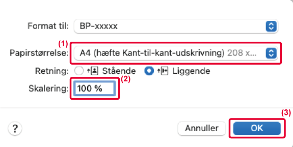Når der er indstillet langt papir, skal du vælge "Landscape".