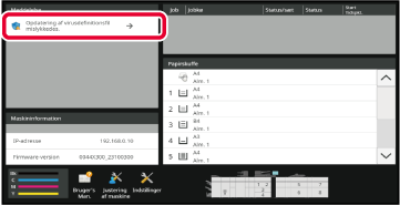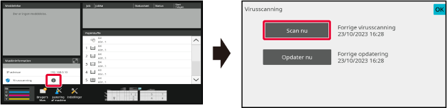 Når der registreres en virus i forbindelse med inputdata, vises det på berøringspanelet, at der er registreret en virus, inputdataene eller det job, der skal indlæses, annulleres, og de data eller jobdata, der skulle udskrives, kasseres. Data i datainputkilden (USB-hukommelse, ekstern server osv.) bliver ikke slettet. Når der registreres en virus i forbindelse med outputdataene, vises det på berøringspanelet, at der er registreret en virus, outputdataene eller det job, der skal udskrives, annulleres, og outputdataene eller jobdataene slettes. Meddelelsen om virusdetektion bliver vist i "Besked" på skærmen Maskinstatus. |